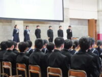 1年生を体育館に迎え入れ、生徒会役員が中心となって、滑川中学校の紹介を行いました。